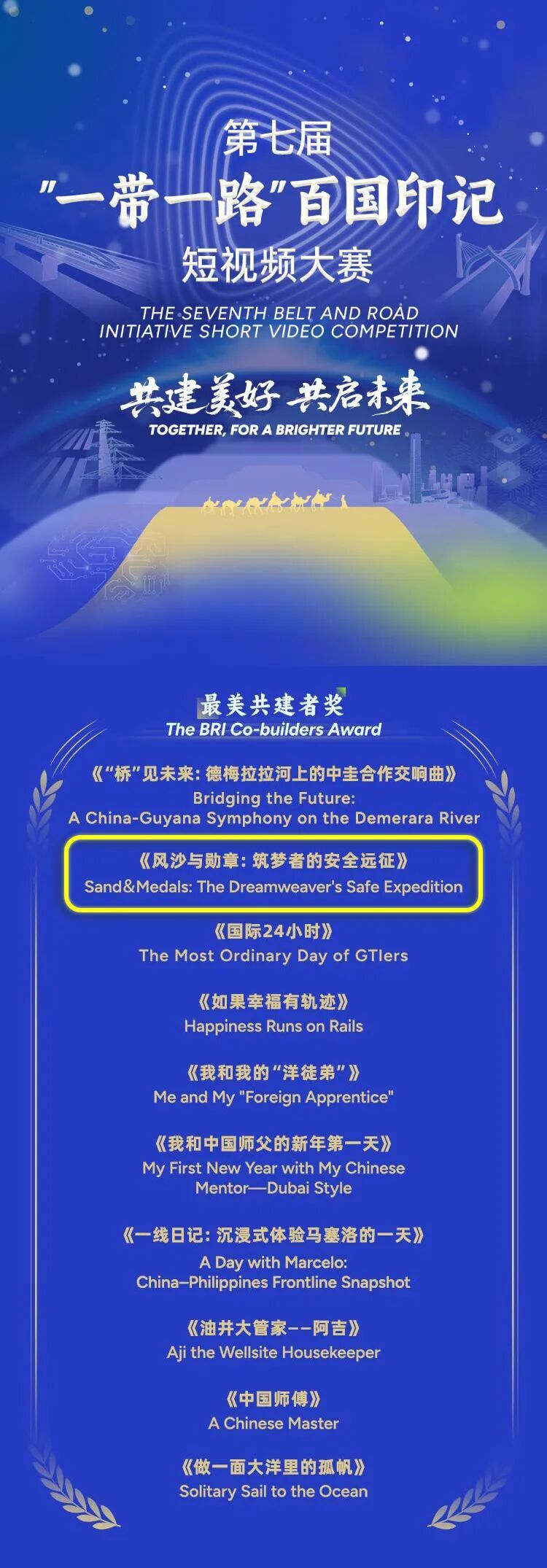 日前,由中國(guó)公共外交協(xié)會(huì)、環(huán)球網(wǎng)聯(lián)合主辦,國(guó)務(wù)院國(guó)資委新聞中心、中國(guó)駐柬埔寨王國(guó)大使館、柬埔寨王國(guó)駐華大使館、中國(guó)駐南非共和國(guó)大使館、中國(guó)駐保加利亞共和國(guó)大使館、中國(guó)駐塞爾維亞共和國(guó)大使館支持的第七屆“一帶一路”百?lài)?guó)印記短視頻大賽落下帷幕,大賽以“共建美好,共啟未來(lái)”為主題,吸引了來(lái)自全球130余個(gè)國(guó)家和地區(qū)的近2000部作品參賽。經(jīng)過(guò)激烈角逐,共有161部作品脫穎而出,哈電集團(tuán)短視頻作品《風(fēng)沙與勛章:筑夢(mèng)者的安全遠(yuǎn)征》榮獲“最美共建者”獎(jiǎng)。