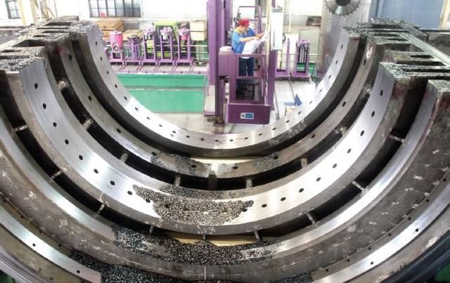 一臺臺“精品”的成功出產(chǎn),刻錄著9米立車的赫赫功勛。2007年,企業(yè)開始推行6S管理,廠區(qū)面貌發(fā)生了翻天覆地的變化,9米立車也披上了“新外衣”,顯得更加神清氣爽。在生產(chǎn)高峰期,9米立車平均一年能加工上百個工件,最小的是十幾公斤一塊的壓板,排成一圈24塊;最大的要數(shù)黃登轉(zhuǎn)子支架中心體,重量幾乎達到了9米立車承重極限:產(chǎn)品質(zhì)量件件一流,9米立車操作者所在的班組也被譽為“公司安全質(zhì)量優(yōu)秀班組”。